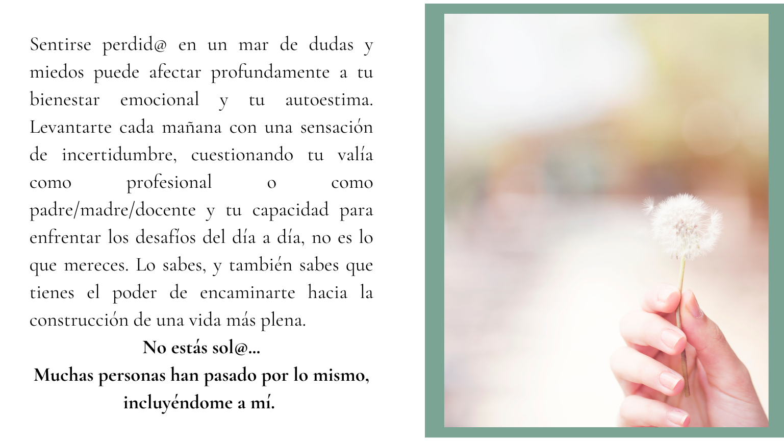 Hoy quiero ayudarte a transformar tu vida, y por ende, la de ellos también. Mientras lees estas palabras, quiero que sepas que comprendo lo que significa enfrentarse a momentos de desesperación y dolor. He estado allí, y a veces sigo enfrentando desafíos similares. Pero lo que sé con certeza, es que esos momentos difíciles es donde se forjan las lecciones más profundas. Aunque hay aspectos de la vida que están más allá de nuestro control, siempre podemos elegir cómo responder a esos desafíos. Es por esto que la relación que tengas contigo mism@ va a jugar un papel fundamental: cuanto más sólida sea, más capaz serás de enfrentar el dolor, descubrir aprendizajes valiosos y emerger más fuerte y más sabi@.